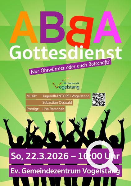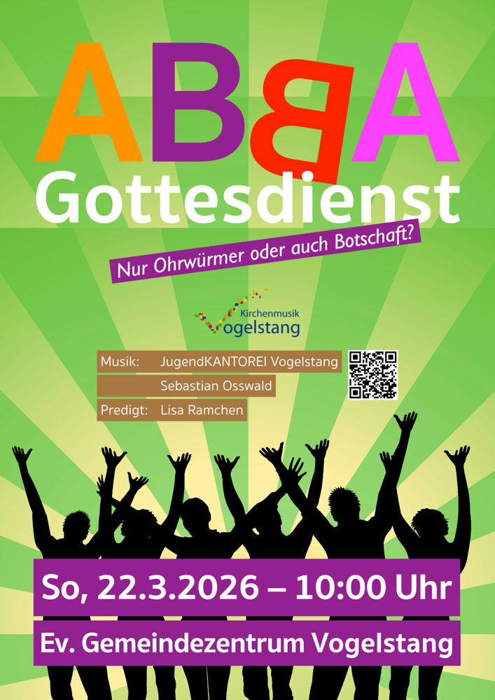 Die JugendKANTOREI Vogelstang bringt Hits der Kult-Band ABBA mit (Mama mia!, Super Trouper…) und Pfarrerin Lisa Ramchen wird sich im Gottesdienst damit beschäftigen, ob die Lieder auch Anknüpfungen an unseren Glauben bieten.