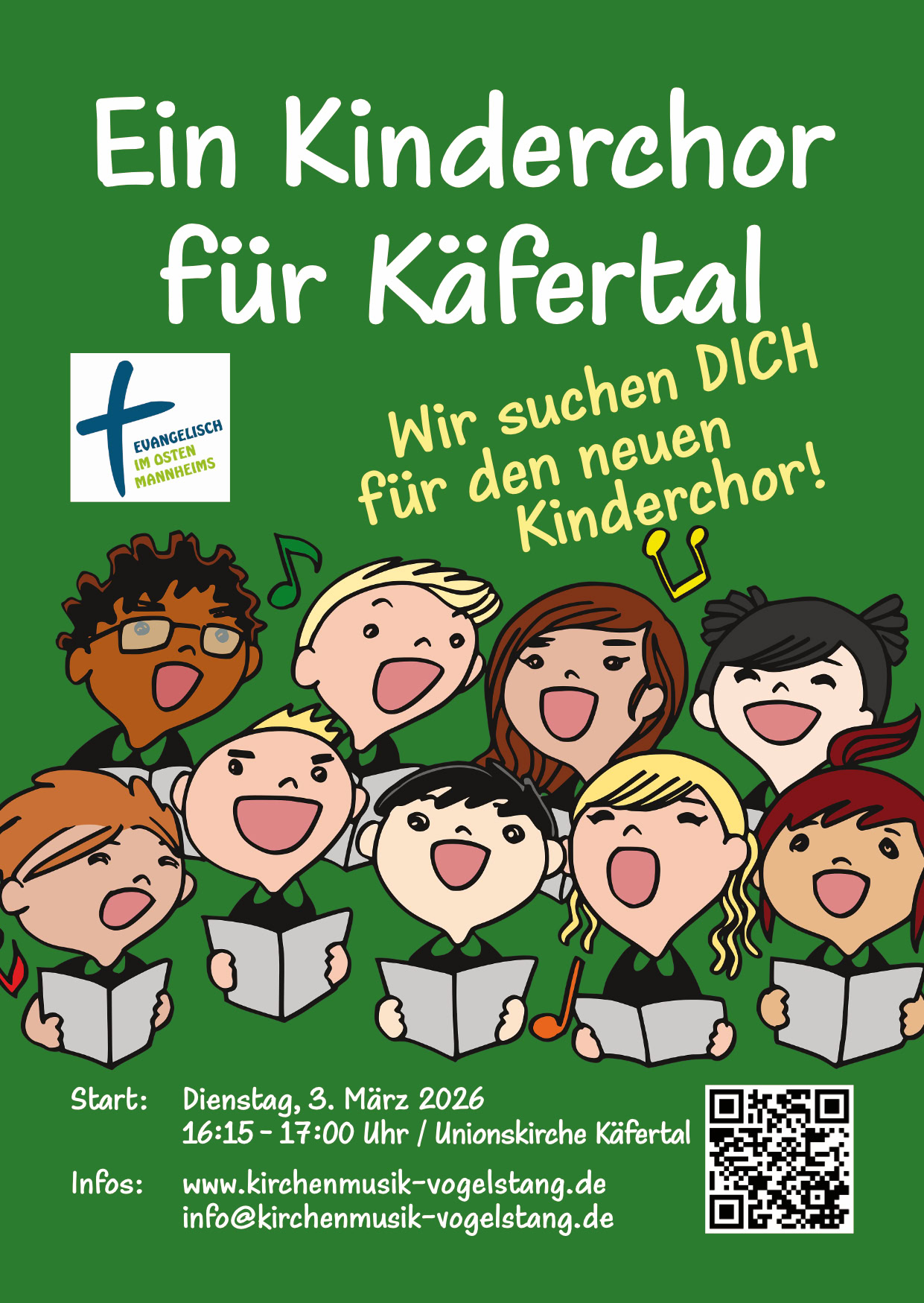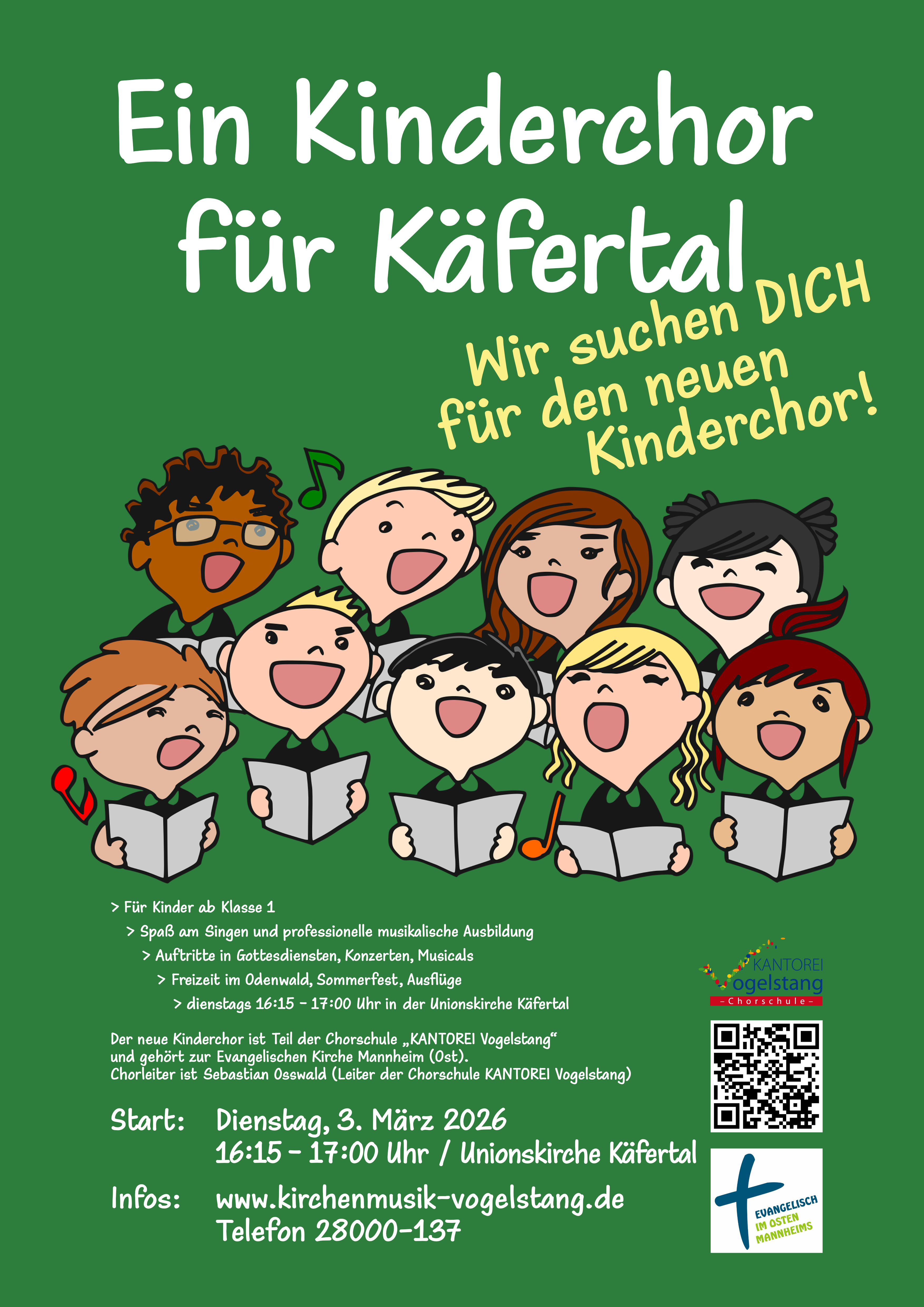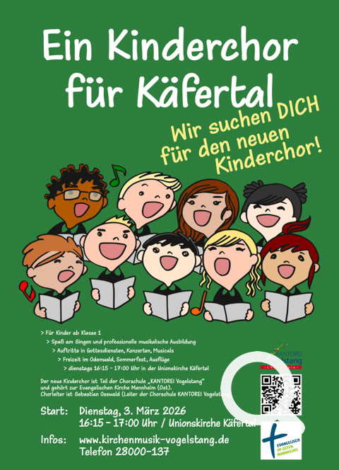 Kinderchor-Gruppen der Kantorei Vogelstang gibt es in Wallstadt, Vogelstang und im Rott. Käfertal fehlte bisher, das soll sich nun ändern! Am Dienstag, 3. März um 16:15 Uhr startet eine neue Chorgruppe in der Unionskirche. Der Chor steht allen Kindern ab der 1. Klasse offen. Wir werden viele Lieder singen, unsere Stimme und unser Gehör fachmännisch trainieren und in Gottesdiensten auftreten und jedes Jahr ein Musical aufführen.