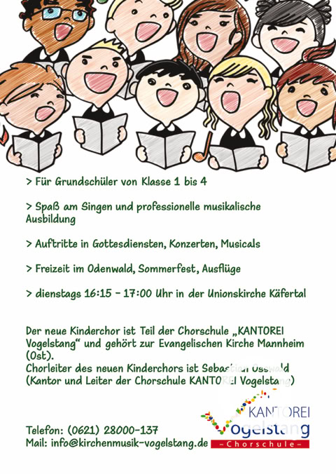 Kinderchor-Gruppen der Kantorei Vogelstang gibt es in Wallstadt, Vogelstang und im Rott. Käfertal fehlte bisher, das soll sich nun ändern! Am Dienstag, 3. März um 16:15 Uhr startet eine neue Chorgruppe in der Unionskirche. Der Chor steht allen Kindern ab der 1. Klasse offen. Wir werden viele Lieder singen, unsere Stimme und unser Gehör fachmännisch trainieren und in Gottesdiensten auftreten und jedes Jahr ein Musical aufführen.